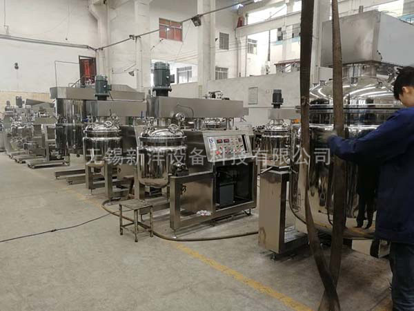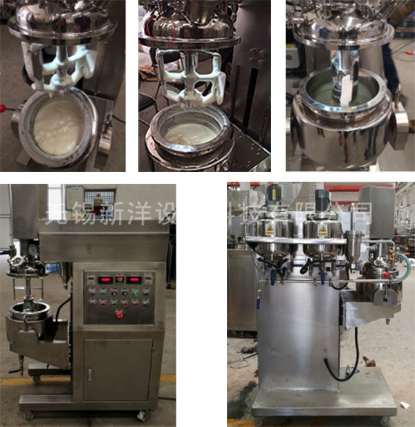 物料在水鍋、油鍋內(nèi)通過(guò)加熱、攪拌進(jìn)行混合反應(yīng)后,由真空泵吸入乳化鍋,通過(guò)乳化鍋內(nèi)上部的中心攪拌、聚四氟乙烯刮板始終迎合攪拌鍋形體,掃凈掛壁粘料,使被刮取的物料不斷產(chǎn)生新界面,再經(jīng)過(guò)葉片的剪斷、壓縮、折疊,使其攪拌、混合而向下流往鍋體下方的均質(zhì)器處,物料再通過(guò)高速旋轉(zhuǎn)的切割輪與固定的切割套之間所產(chǎn)生的強(qiáng)力的剪斷、沖擊、亂流等過(guò)程,物料在剪切縫中被切割,迅速破碎成200um-0.2um的微粒,由于乳化鍋內(nèi)處于真空狀態(tài),物料在攪拌過(guò)程中產(chǎn)生的氣泡被及時(shí)抽走。采用抽真空的方式,使所生產(chǎn)的制品在攪拌過(guò)程中不再混入氣泡,從而保證可制造出富有光澤、細(xì)膩及延展性良好的產(chǎn)品。